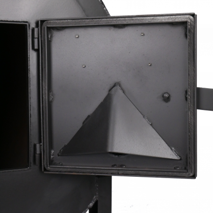 Піч обладнана камерою допалювання вторинних газів. У процесі горіння деревини виділяються гази, які під впливом високих температур та подачі вторинного кисню (через форсунки) спалахують у цій камері. Таким чином, ККД печі піднімається до 90%.