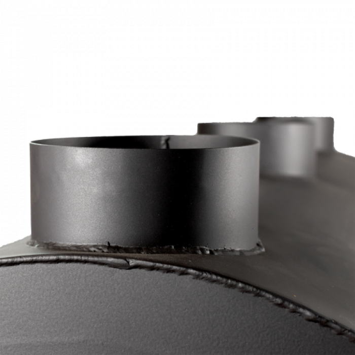 Піч обладнана камерою допалювання вторинних газів. У процесі горіння деревини виділяються гази, які під впливом високих температур та подачі вторинного кисню (через форсунки) спалахують у цій камері. Таким чином, ККД печі піднімається до 90%.
