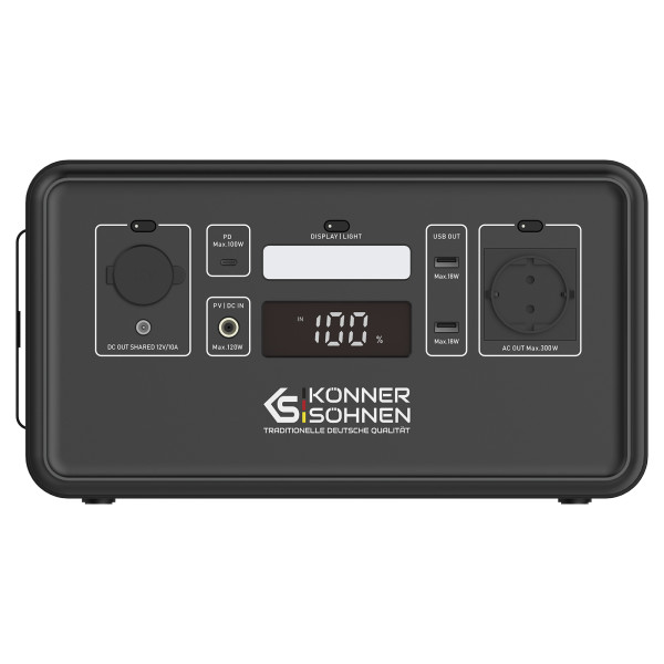Мобільна портативна електростанція KS 300PS німецької торгової марки Könner & Söhnen виготовляється з використанням високоякісних LifePO4 літій-залізо-фосфатних акумуляторів високої ємності, які мають більш високу енергетичну щільність в порівняні з Li-ion, вони можуть зберігати більше енергії в компактному форматі та мають великий життєвий цикл – 4000 циклів заряд-розряд. Вона стане надійним помічником для зарядки пристроїв в дорозі або в разі збоїв електропостачання. Її потужності буде достатньо для роботи такої техніки як смартфон, цифрова камера, планшет, дрон, міні-холодильник, насос для накачування, вентилятор. Вона працює тихо, тому дозволить живити електричні пристрої та насолоджуватись часом без будь-якого заважаючого шуму.