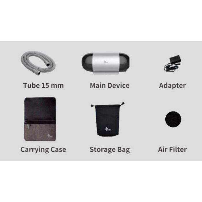 M1 Міні - це дорожній пристрій CPAP з автоматичним регулюванням тиску, розроблений для лікування хропіння та синдрому обструктивного апное сну та гіпоопное. Цей пристрій настільки маленький і легкий, що його можна легко помістити на долоні.