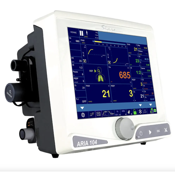 Aria 104 відзначається ергономічною конструкцією та інтуїтивно зрозумілим інтерфейсом, що значно полегшує роботу медичного персоналу, навіть у складних клінічних умовах. Він оснащений кольоровим дисплеєм із високою роздільною здатністю, на якому відображаються всі ключові параметри вентиляції, динаміка кривих тиску та об’єму, а також тривоги з відповідною інформацією.