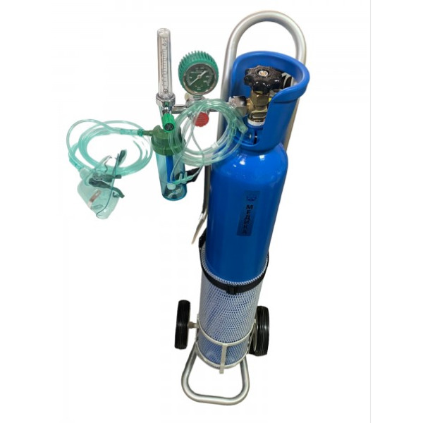 - До складу виробу входять: манометр, редуктор, зволожувач, витратомір (1-15 л/хв), регулятор потоку, запобіжний клапан, носова канюля 2 м, киснева трубка з маскою , заправний перехідник, візок.