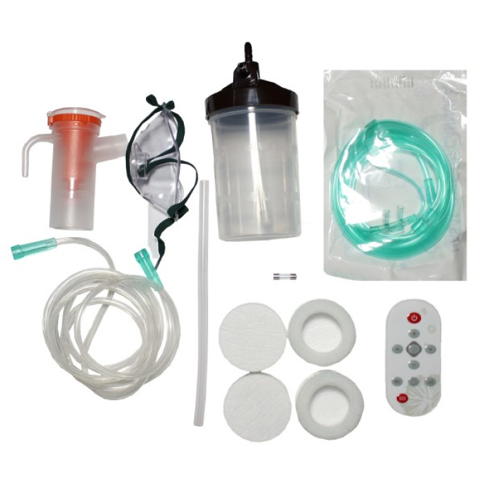 В комплекті носова канюля, пульт дистанційного керування, небулайзер (інгалятор) та запасні фільтра (4шт).