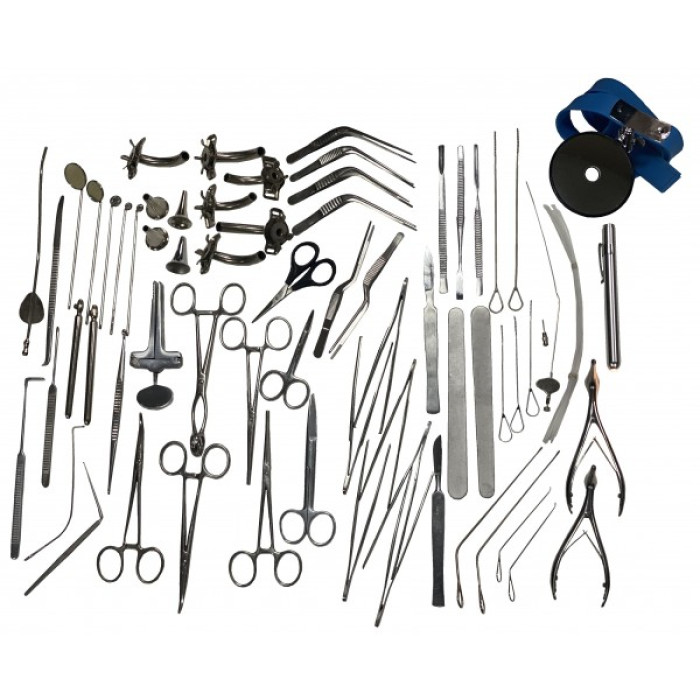 Пінцет вушний списовидний анатомічний 1 шт Пінцет вушной коліновидний 4 шт Пінцет хірургічний загального призначення 150 мм 2 шт Пінцет анатомічний загального призначення 150 мм 4 шт Ручка для гортаних і носоглоткових дзеркал 2 шт Трубка трахеотомічна металева 6 шт Шпатель для язика 2 шт Ложка вушна двухстороння 1 шт Скальпель черевастий середній 1 шт Скальпель очний середній 1 шт Елеватор для мигдалин 1 шт Язикотримач 1 шт Роторозширювач винтовий 1 шт Рефлектор налобний 1 шт Дзеркало носове 2 шт Ліхтарик "МЕДИКА" діагностичний 1 шт |