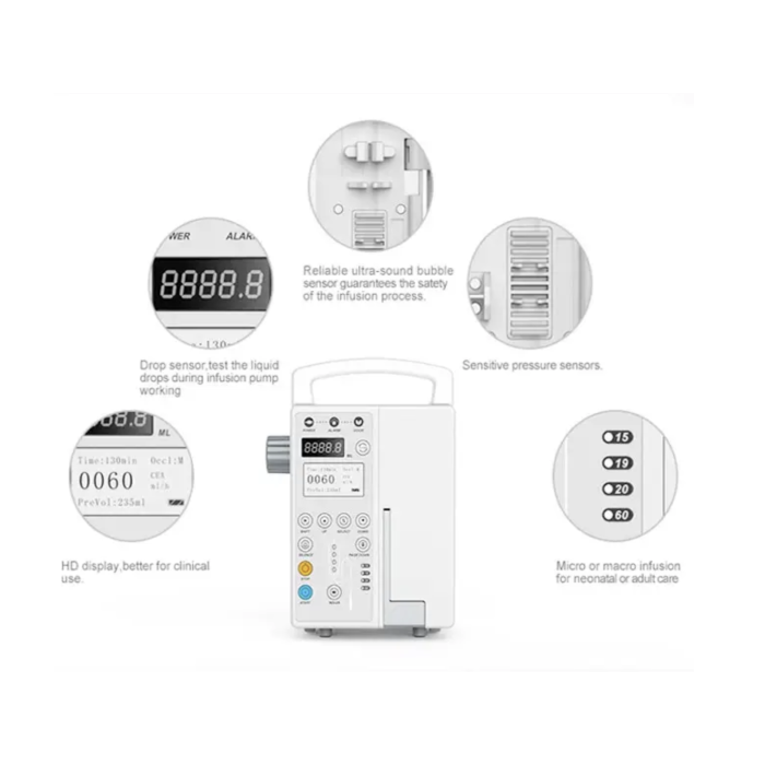 - Аудіо-візуальна система тривог: наявність бульбашок у трубці, закупорка трубки, відчинені дверцята, несумісність інфузійної системи, батарея розряджена, закінчення інфузії, збій пристрою, несправність, системна помилка, низький рівень заряду батареї, невиконана операція тощо