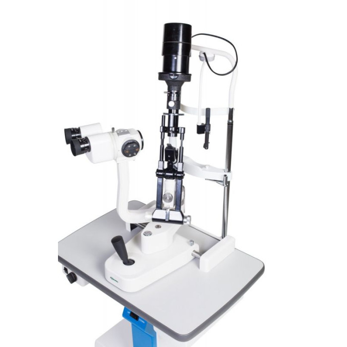 Освітлювальна система верхнього типу з галогенною лампою забезпечує спрямоване, яскраве та рівномірне підсвічування, що дозволяє гнучко формувати світлову пляму та детально досліджувати рельєф і структури переднього відрізка ока.