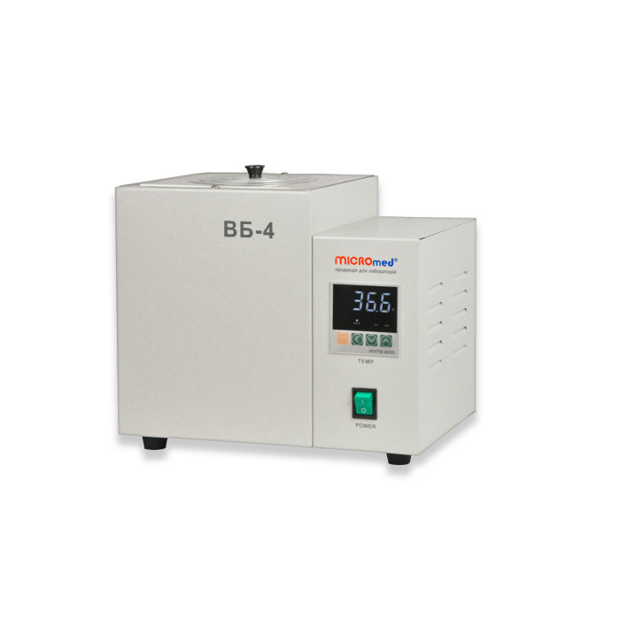 Баня водяна ВБ-4 MICROmed (висота камери 230мм) призначена для нагріву і термостатування вмісту під час проведення аналізів і досліджень, що вимагають точної стабільної температури. Баня водяна термостатирувальна знайшла широке застосування в лабораторіях медичного та наукового профілю – науково-дослідних, ветеринарних, діагностичних і промислових лабораторіях. Фахівці знають цей вид лабораторного обладнання, як рідинний термостат. Характеристики приладу також дають змогу використовувати його як термостат для гемокоагуляції. Принцип дії лабораторної бані ґрунтується на передачі теплової енергії від нагрівальних елементів до води в робочій камері бані, і надалі до встановлених ємностей з рідиною, яка термостатується. Баня водяна з електричним підігрівом MICROmed БВ-4 складається із зовнішнього корпусу, робочої камери з полірованої неіржавкої сталі, мікропроцесорного блоку управління, цифрового датчика температури, нагрівального елемента і кришки. Зовнішній корпус відділений від робочої камери термоізолятором. Конструкція корпусу забезпечує комфортну і безпечну температуру зовнішніх частин. Трубчастий нагрівальний елемент, у нижній частині робочої камери, захищений від механічних пошкоджень додатковою захисною кришкою. Лабораторний водяний термостат ВБ-4 комплектується верхньою кришкою з комплектом концентричних кілець. Кришка з концентричними кільцями використовується під час розміщення в бані колб, склянок та іншого посуду, що виступає за верхній габарит робочої камери. Застосування кришки знижує витрату електроенергії та прискорює час нагріву води і стабілізації робочої температури. Водяна баня з терморегулятором має можливість встановлювати і підтримувати температуру з точністю 0,1°С. На лицьовій панелі приладу розташовані мережевий вимикач і мікропроцесорний блок керування. Встановлення температури здійснюється сенсорними кнопками. На цифровому індикаторі відображається реальна і встановлена температура, режим роботи нагрівальних елементів. Мікропроцесорний блок керує роботою нагрівальних елементів під час нагрівання і стабілізації заданої температури. Контроль температури всередині камери здійснюється цифровим вбудованим термометром з дискретністю 0,1°С У конструкції Бані лабораторної термостатуючої ВБ-4 є автоматична система захисту, яка відключить нагрівачі в разі відсутності води всередині камери. Система захисту від сухого пуску стане на заваді поломці Вашого обладнання в разі порушення правил експлуатації. Мікропроцесорний блок управління лазні ВБ-4 має функцію таймера. Наявність таймера спрощує експлуатацію приладу і значно зменшує споживання електричної енергії.