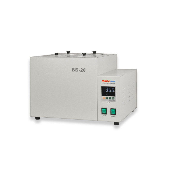 Баня водяна ВБ-20 MICROmed призначена для нагріву і термостатування вмісту під час проведення аналізів і досліджень, що вимагають постійної температури. Фахівці знають цей вид лабораторного обладнання, як термостат рідинний або лабораторний водяний термостат.