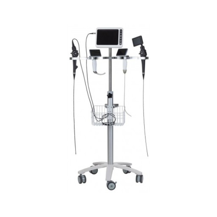 - Мобільна пересувна стійка з регулюванням висоти і зручним утримувачем для відеоендоскопа і монітора 8".