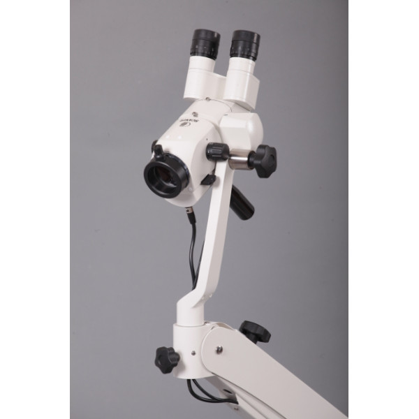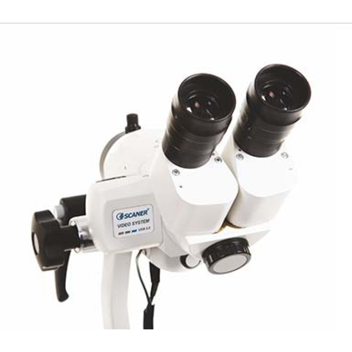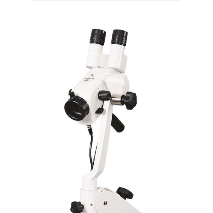 Штатив. Компактний, стійкий. Оснащений пантографічним пружинним важелем і гумовими колесами з системою та регульованим спрямуванням. Вісь на голчастих та опірних підшипниках. Зручне розташування фрікційних ручок для фіксації важелів та оптичної головки.
