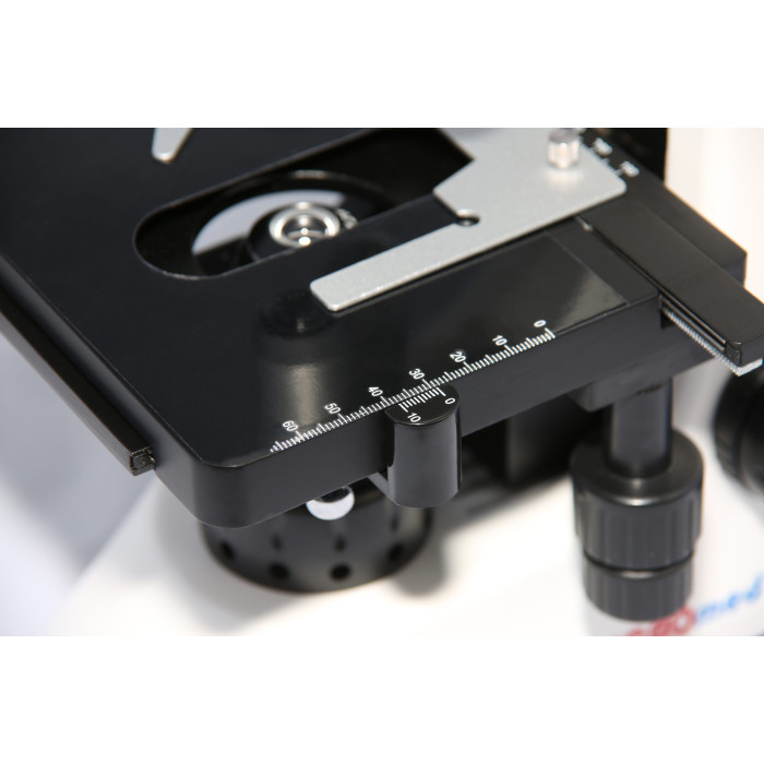 матричний світлодіодний освітлювач;збільшений предметний столик (140х132мм) з коаксіальною рукояткою керування у двох площинах (X,Y);