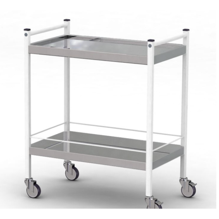 Стіл комплектується: 2-ма полицями з нержавіючої сталі і 2-ма ручками з боків для зручності переміщення. Верхня полиця має профільний край, а нижня полиця має огороджувальний бар'єр, що оберігає медикаменти та інструменти від випадкового падіння.