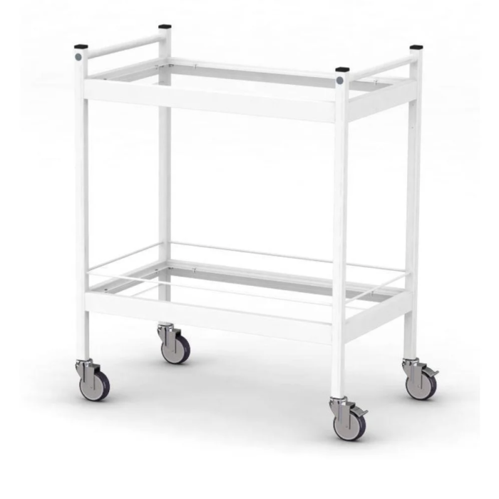 Стіл комплектується: 2-ма полицями зі скла і 2-ма ручками з боків для зручності переміщення. Верхня полиця має профільний край, а нижня полиця має огороджувальний бар'єр, що оберігає медикаменти та інструменти від випадкового падіння.