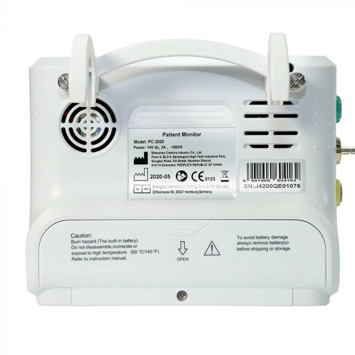 Монітор пацієнта PC-3000 від CREATIVE MEDICAL дозволяє контролювати такі параметри як: ECG (електрокардіограма), RESP (частота дихання), SpO2 (насиченість крові киснем), PR (частота серцевих скорочень), NIBP (неінвазивний артеріальний тиск), TEMP (температура), та має сумку для транспортування
