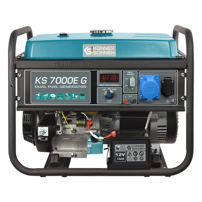 Експлуатація генератора на газу підвищує моторесурс двигуна. Все необхідне для підключення балону йде в комплекті: генератор оснащений регулятором нульового тиску, шлангом з понижуючим редуктором; необхідно тільки під’єднати генератор до Вашого газового балону. Генератор не призначений для підключення до газової магістралі. При необхідності газобензинові моделі легко перемкнути на роботу на бензині. Потужний одноциліндровий 4-х тактний двигун K&S з повітряним охолодженням забезпечує стабільну та надійну роботу генератора. Особливість даної линійки генераторів Könner & Söhnen® полягає у можливості запуску і роботи лише на газі (LPG) – для запуску немає необхідності додавати бензин.