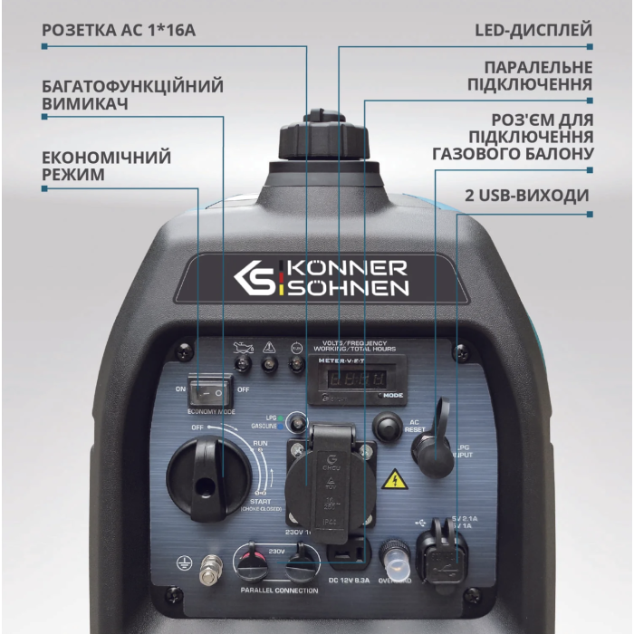| Led дисплей | Лічильник мотогодин, частота, вольтаж |