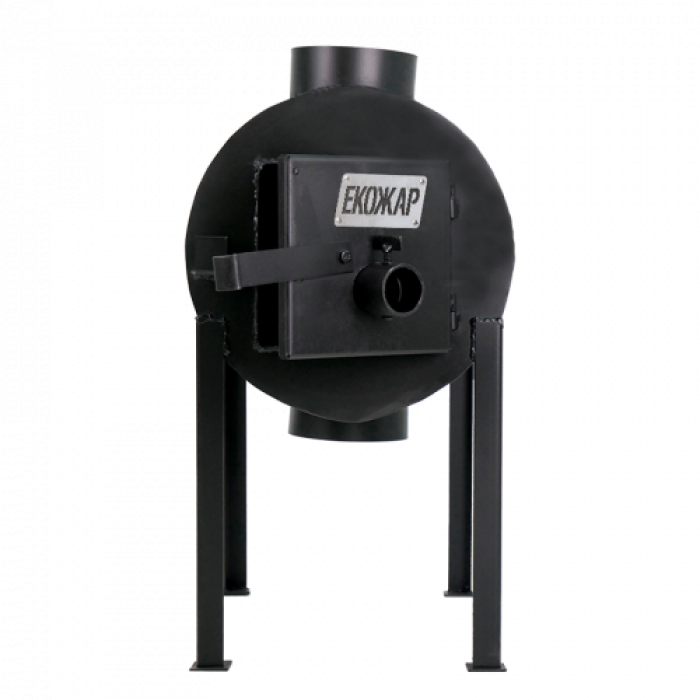 Для помещений с площадью до 150 м кв. была разработана буржуйка Экожар Про 350. Конструкция с вертикальными выходными тепловыми патрубками позволяет установить печку посредине помещения, а нагретый воздух равномерно распределить по всему объему теплопроводом (гофрой или металлическими коробами). Длинна топки составляет 800мм, это позволяет закладывать длинные поленья, тем самым увеличивается работа печи с одной загрузки.