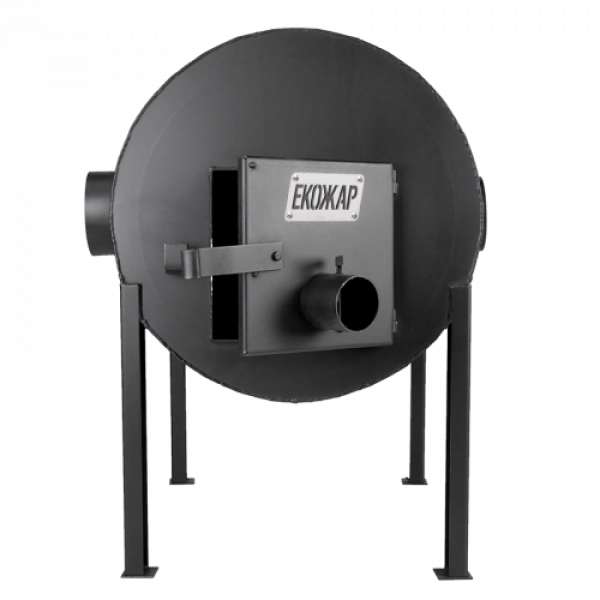 При необходимости отопления объемных ангаров, больших производственных цехов, складов применяют буржуйку Экожар Про 500. Толщина стали топочной камеры 10мм при длине 800мм и диаметре 520мм. Такая топка помимо длительного срока эксплуатации обеспечивает работу печи на одной закладке до девяти часов. Для предотвращения выхлопа не сгоревших газов в помещение на дверце, после патрубка забора воздуха, установлен козырек.