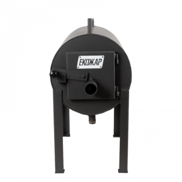 В помещениях, где есть возможность установить радиаторы отопления, используют буржуйку с водным контуром Экожар КВД 200. Теплоносителем выступает вода, нагрев которой происходит в полости между топкой печи и внешним кожухом. Передача прогретой воды от буржуйки к радиаторам осуществляется за счет циркуляционного насоса. Для контроля степени нагрева воды сделано посадочное место под градусник. Размер патрубков для подключения водного контура - 1 дюйма и может быть изменён по индивидуальному заказу.