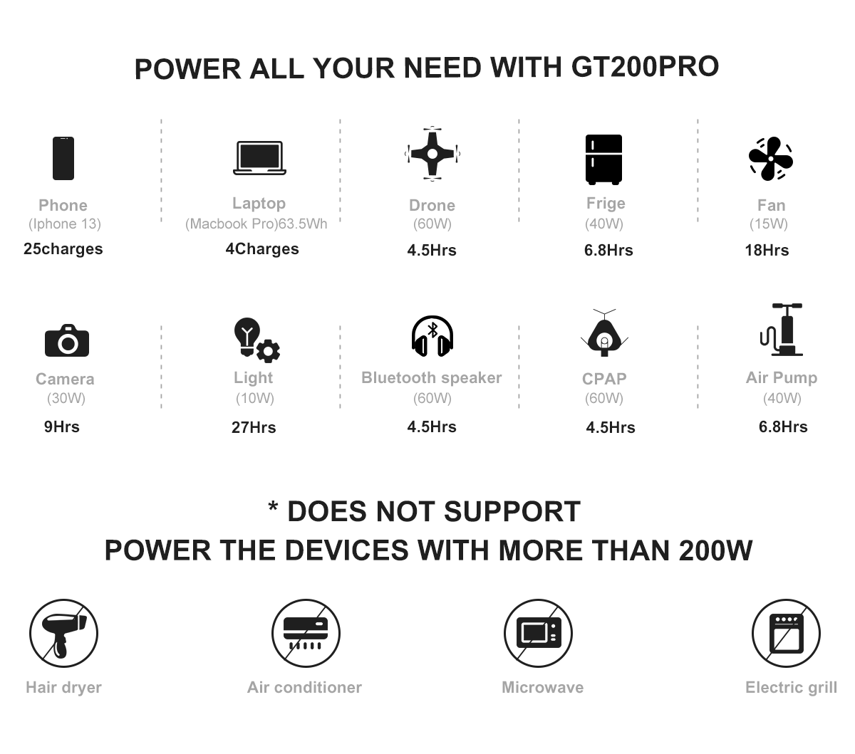 GT200 Pro имеет 1 х AC порт, 4 х DC порта, 2 USB-порта, 1 х QC 3.0 USB-порт и 1 х PD порт быстрой зарядки. Подходит для телефонов, планшетов, ноутбуков, цифровых камер, дронов, автомобильных холодильников, вентиляторов, ЖК-телевизоров, CPAP и многих других устройств.