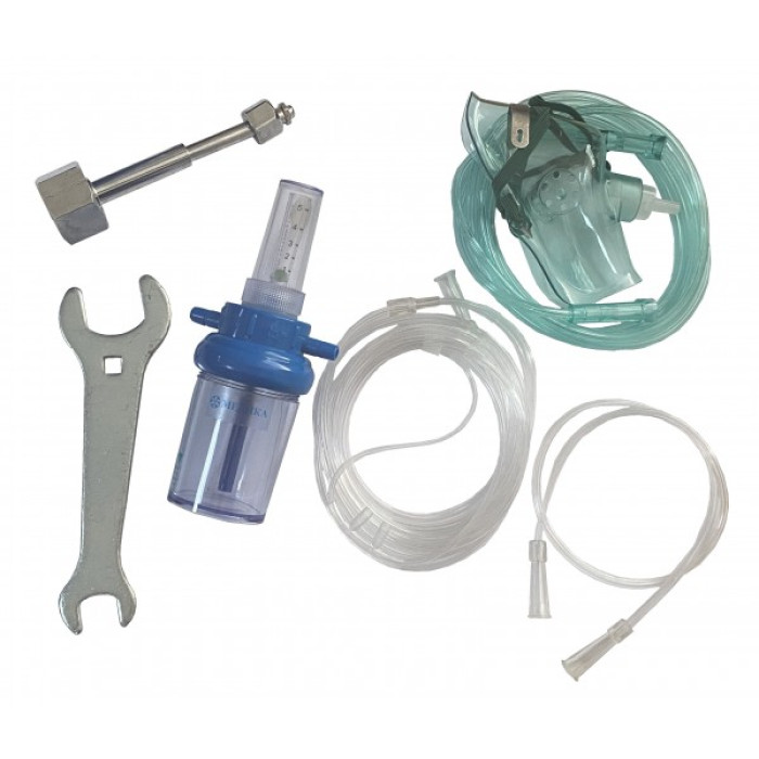 Комплектация кислородного баллона: прочный пластиковый кейс, манометр, увлажнитель, расходомер (1-5 л/мин), регулятор потока, предохранительный клапан, кислородная трубка с назальной канюлей тип 2 (на два выхода) – 1 шт., кислородная маска с трубкой на 2м -1 шт ,соединительная трубка, ключ гаечный, трубка - переходник заправочная.