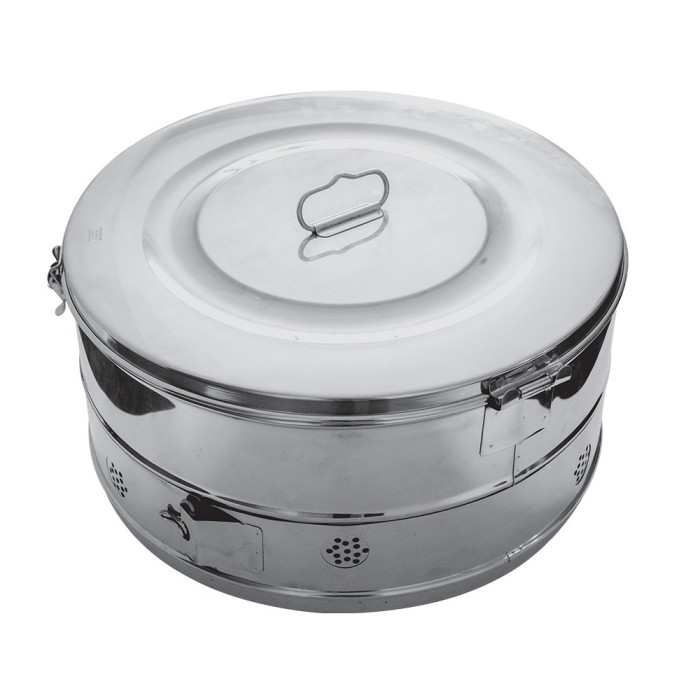 Коробки для стерилизации цилиндрические без фильтра- изготавливаются из нержавеющей стали марки AISI 304, которая кислотостойкая и выдерживает температуру до 900ºС, обеспечивают сохранение стерильности материалов. Должны храниться при температуре от -50ºС до +50ºС и относительной влажности 80% при температуре +25ºС. Воздух помещения не должен содержать примесей, вызывающих коррозию. Имеют ручки на крышке эргономичной формы, для более удобной переноски коробки.