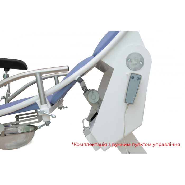 Стандартно кресло КГ-3Е комплектуется чашей из нержавеющей стали, ручным пультом управления и черными металлическими обшитыми подколенниками.