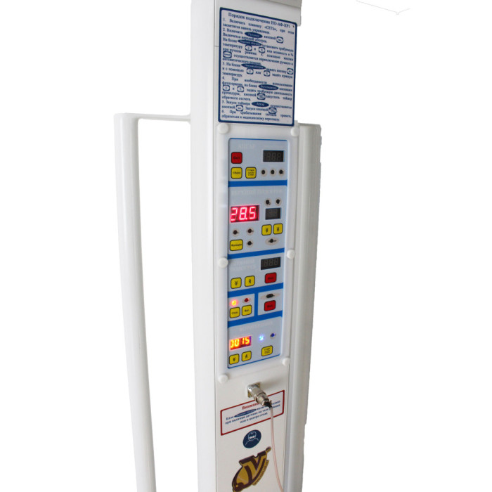 Мощность обогрева управляется микропроцессорной системой. Температура тела ребенка постоянно контролируется при помощи высокоточного цифрового медицинского датчика. Разъем для него находится в средней части стойки устройства. В ней расположен и пульт управления, с помощью которого выполняются управление верхним блоком, нижним блоком, фототерапией, включение общего света. При выходе за пределы установленных критических температур тела новорожденного срабатывают световая и звуковая сигнализации. Красный светодиодный индикатор тревожной аудиовизуальной системы находится в верхнем блоке устройства.