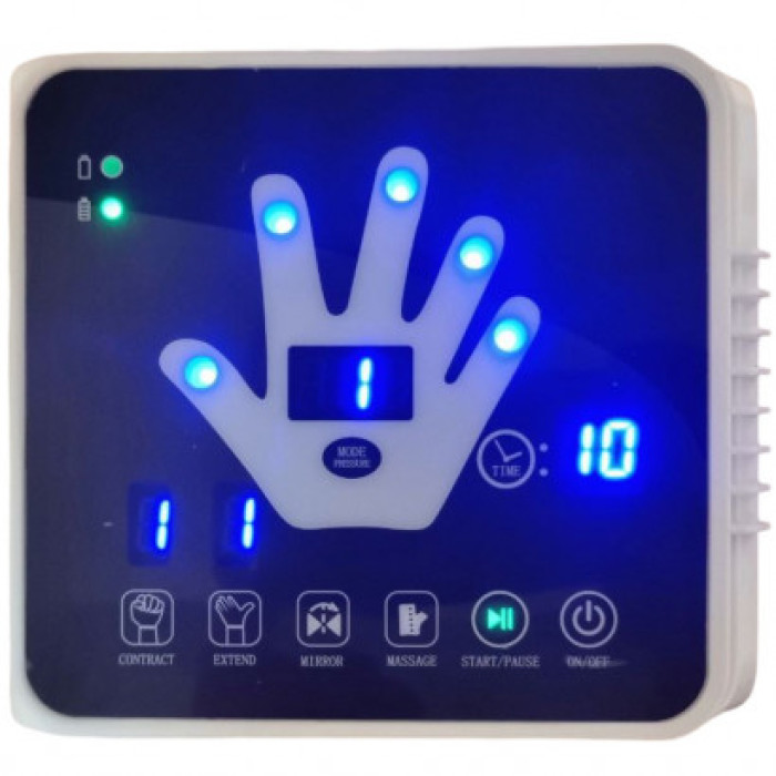 - LED-дисплей отображает: индикатор заряда аккумулятора, скорость сжатия/разжатия пальцев, функцию «зеркального управления», старт/пауза, включение/выключение, режим процедуры, время процедуры, а также индикаторы включения и отключения каждого пальца по отдельности.
