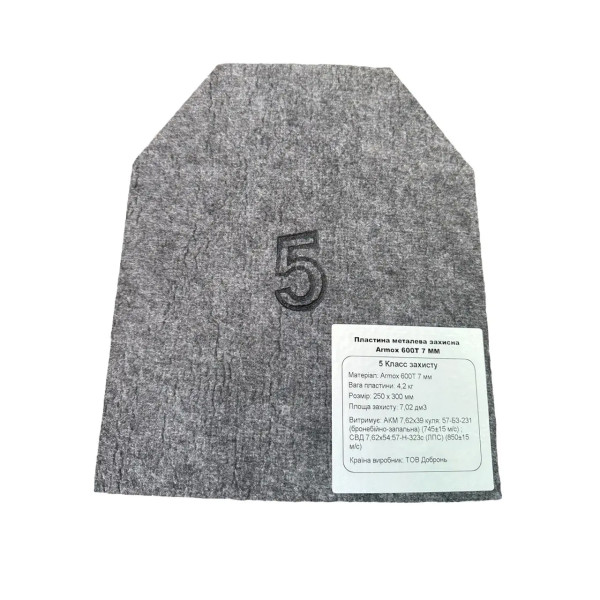 Броневая пластина соответствует нормам 5-го класса, а также классам защиты, предшествующим ему. Преимуществом является потовщеність стального листа, вот почему Армокс-600Т 250 x 300 х 7 мм можно классифицировать как плиту с высокой степенью защиты (по сравнению с бронеплитами, что имеют схожие характеристики).