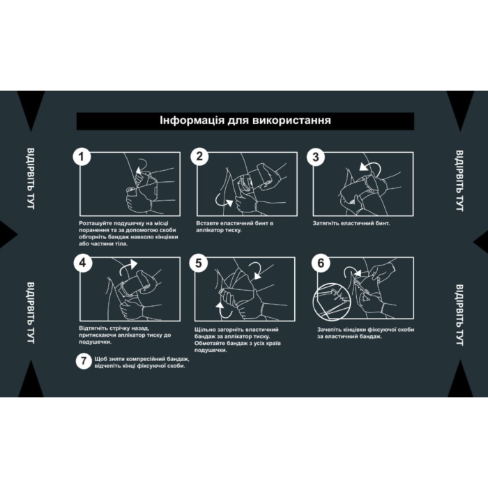 Завдяки зручній упаковці з насічками бандаж швидко витягується, розпаковується та оперативно застосовується.
