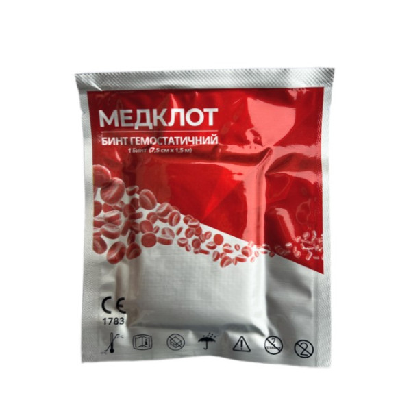 Гемостатичний бинт Medclot являє собою бинт із гемостатичним просоченням, розроблений спеціально для зупинки сильних кровотеч та для щільної тампонади рани.