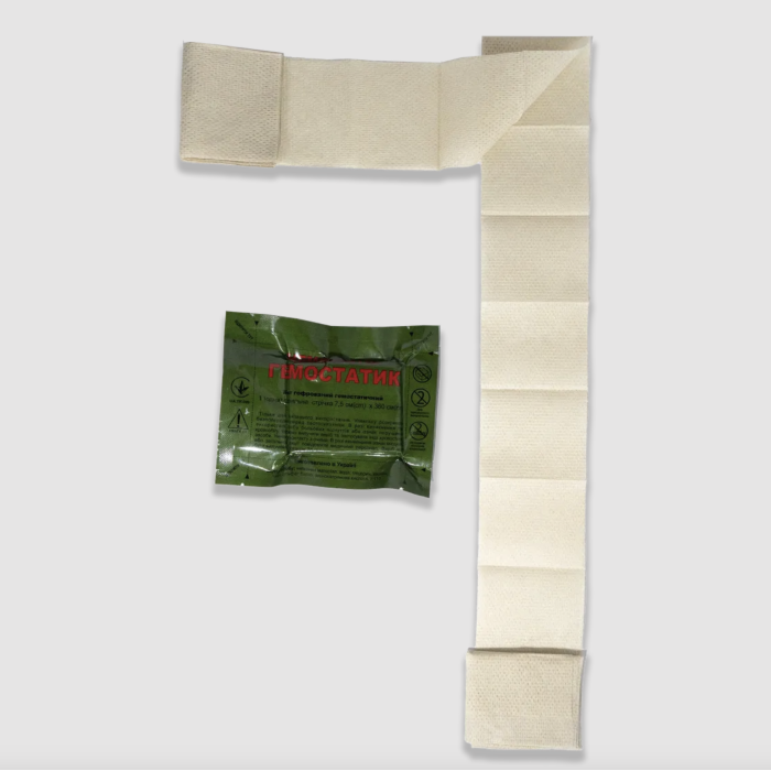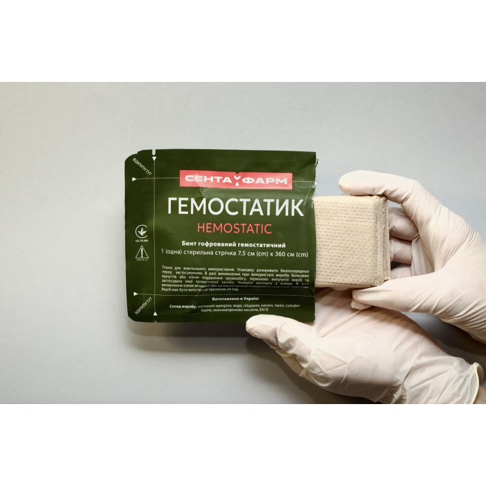 «ГЕМОСТАТИК» являє собою хімічний гемостатичний засіб у формі гофрованого бинту.«ГЕМОСТАТИКИ» призначені для зупинки інтенсивних кровотеч, включаючи кровотечі з магістральних судин (артерій), в тому числі в «польових» умовах на етапі надання само-, взаємо- та першої домедичної чи медичної допомоги.Застосування «ГЕМОСТАТИКУ» не потребує спеціальних медичних знань чи проведення підготовчих процедур, засіб може використовуватись за жорстких кліматичних умов (температура від -40 ̊С до +50 ̊С, вологість може перевищувати 95%).